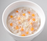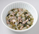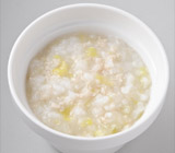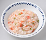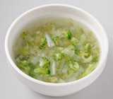 - 野菜スープに白菜を加えて電子レンジで40秒加熱。かゆ、とり肉のだし煮を加えて混ぜ合わせる。