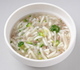 - うどんは短く切る。野菜スープを沸かした鍋に、うどん、ひき肉、玉ねぎ、ブロッコリーを入れて煮込み、水溶き片栗粉でとろみをつける。