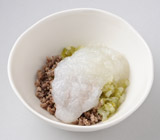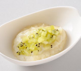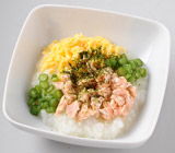 - かゆに果汁を加えて混ぜる。魚ほぐし身はから煎り、卵は炒り卵にする。いんげんはやわらかくゆでる。かゆに具材をのせ、青のりを散らす。