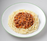 - スパゲティは2cmの長さに折ってやわらかくゆで湯をきる。フライパンにサラダ油ごく少量(分量外)をひいて熱し、肉と野菜を炒め、トマトジュースを加えて水分が半分になるまで煮詰め、スパゲティにかける。