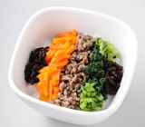 - ほうれん草とにんじんにだし汁を回しかけ、ごま油としょうゆを加えて風味をつける。炒り卵で飾る。
