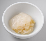 - りんごは電子レンジで1分加熱。大根おろしも電子レンジで1分加熱し、水溶き片栗粉を入れてさらに40秒加熱して、りんごにかける。