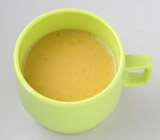 - 野菜スープにクリームコーンを加えて煮立て、卵黄を混ぜる。