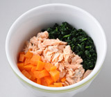 魚貝のほぐし身タラ・鮭・まぐろ・サバ・ほたてなどお好みの魚貝をゆでるか蒸して骨を除き、身をほぐして大さじ1~2ずつ冷凍。