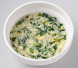 - スープを沸かした鍋に、わかめ、ほうれん草、片栗粉を加えてひと煮立ちさせ、溶き卵を入れる。
