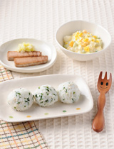 - ひき肉は大人用とともにだし汁で炒り煮してそぼろにする。青菜はさっとゆでてしょうゆ、みりんを和えてみじん切りにする。子ども用のそぼろと青菜を取り分け、軟飯に混ぜて丸くにぎる。