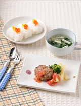 - ハンバーグのたねは塩こしょうする前に子ども用を取り分けて小さく成型。フライパンにバターを薄くひいてたねを焼き、しっかり火を通す。トマトを粗みじん切りして塩少々を加えて加熱し、付け合わせの野菜と一緒にハンバーグに添える。