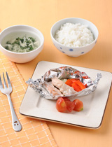 - アルミホイルを15cm角にカットし、サラダ油(分量外)をごく薄くぬる。鮭と野菜をのせ、全体を包んで閉じ、トースターで10分焼く。アルミホイルを開き、鮭の皮と骨を除いてよく冷ましてから与える。