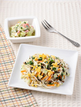 - 子ども用のじゃがいもと玉ねぎはみそこしなどに入れて大人用よりやわらかくゆでる。きゅうりは塩少々を振っておく。マヨネーズで和える。ゆで卵の黄身をほぐしてちらす。