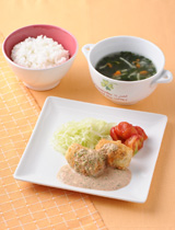 - 炒めたひき肉と玉ねぎ、ゆでたじゃがいもは、味つけ前に取り分け。小さめの俵型に成型して溶き卵、薄力粉、パン粉をつけて揚げる。ケチャップとヨーグルトを合わせたソース(あればブロッコリーのみじん切りを加える)をかけ、ゆで野菜を添える。