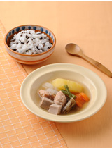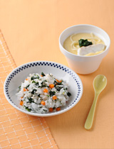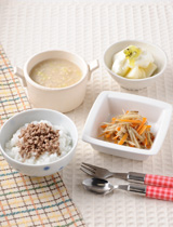 - ひじきは水で戻して洗い、しょうゆ・みりんを加えただし汁でやわらかくなるまで煮て細かく刻む。軟飯にまぜる。