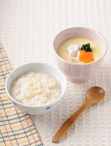 - れんこんはすりおろし、溶いた卵を加えて混ぜたら、熱しただし汁に入れて火にかけ、水溶き片栗粉でとろみをつける。子ども用を取り分け、大人用は塩で調味する。