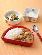 - 子ども用の材料を取り分けたら、小さめの鍋にバターを熱して肉と玉ねぎを炒め、小麦粉とカレー粉、野菜スープを加えてざっと混ぜる。にんじん、じゃがいもを加えてやわらかくなるまでコトコトと煮る。トマトジュース、水溶き片栗粉を加えて味を調える。