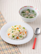 - 野菜は大人用も含めて7mm角に切り子ども用を取り分ける。フライパンにサラダ油を熱し、ほたて貝柱、野菜を炒める。軟飯に塩少々を加えて炒め合わせ、器に盛ってゆで卵の黄身をほぐして散らす。