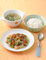 - 子ども用の具材を取り分けたら、牛肉に片栗粉をまぶしてごま油で炒め、パプリカ、ピーマン、玉ねぎを加えて、さらに炒め、もやしスープ大さじ3~4を加えてやわらかく煮る。しょうゆと水溶き片栗粉を加えて混ぜ合わせる。