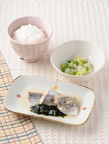 - あじは子ども用を取り分けて小さく切る。だし汁を沸かした鍋に、あじ、わかめ、酒、しょうゆを加えてだしを回しかけながら煮汁が半分になるまで煮る。小骨が残っていないか注意してほぐしながら与える。大人用はだし汁に酒、しょうゆなどを加えて好みの味つけにする。