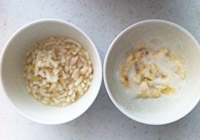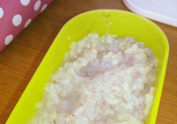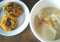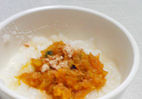 かぼちゃとシラスを耐熱皿に入れて電子レンジでやわらかくなるまで加熱。適当な大きさにつぶしておかゆにのせ、きな粉をふります。おかゆを食べないので甘めのレシピを考えました。