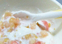 コーンフレークを砕いてお湯でふやかしてから桃のみじん切りを多めに入れてプレーンヨーグルトを入れ、混ぜます。