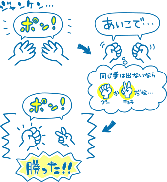 ここから、「2人でじゃんけんしてあいこになったら、自分が出した手が負ける手(1回目にグーを出したら、次はチョキ)を出すと有利」ということになります。