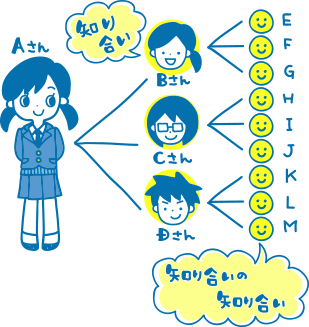 まず、準備として次のような状況を図に表してみましょう。Aさんに3人の知り合いがいたと考えて、さらにその知り合いそれぞれに、また別の3人の知り合いがいたとします。