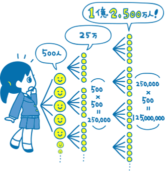 「知り合い」の「知り合い」の「知り合い」までで1億2500万人、ほぼ日本の人口と同じ人数に達するという計算になります。このことから、おおざっぱな計算ですが多くの人は「少なく見積もっても知り合いの知り合いの知り合いで国民の過半数を超える」ということは言えそうです。このように、概算を使って考えてみると、「偶然!」と思っていたこともいつもとは違った見かたをすることができます。