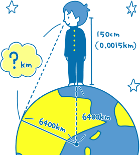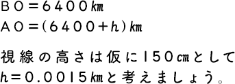 地球はおよそ半径6400㎞の球体です。地球の中心を点Oとして、図のように水平線を見る人の視線の高さを点Aとすると、Aが見わたせる最も遠い場所が点Bになります。