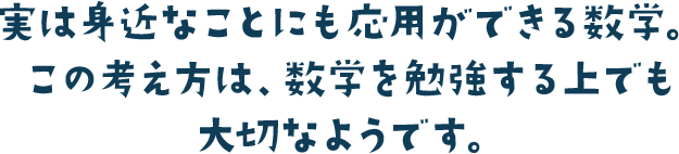 数学とは1つ1つを数にまつわる決まりごとを使って、「なぜそうなるのか」ということを正しく説明できることをポイントとした学問です。ここまでにとりあげたお話のように、数学のアイディアを使えば、さまざまなことを導くことができます。「どうしてそうなるの?」そのことを、しっかり証明できるのが実は数学の魅力。