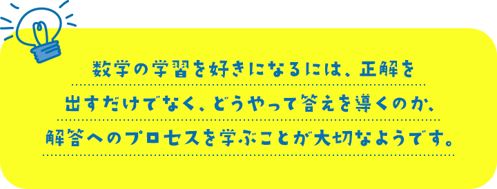 数学を好きになるポイントは、時間をとってじっくり取り組むことです。わからないからと、すぐに答えを見るのではなく、「何か方法がないか」と時間をかけて考え、自分なりに試行錯誤することが理解の幅を広げます。考えた過程があれば、後で答えを知ったときに「なるほど、それならばさっき考えた方法も使える」などと、答えを導く別の方法を得ることもできます。1つの問題にじっくり考え取り組むことが、お子さまが数学の面白さを知るきっかけにつながっていくはずです