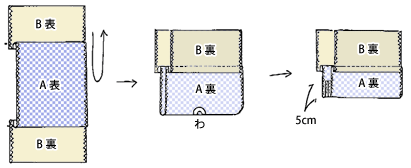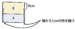 (3)Aの上にBを、内側を表にして重ね、上端と下端を縫い合わせる。