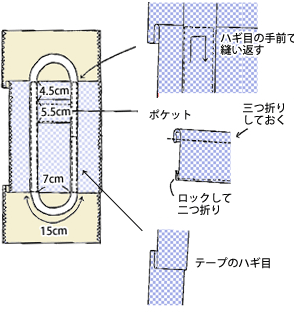 工程(3)のあとに、ポケットとテープを縫い付ける。