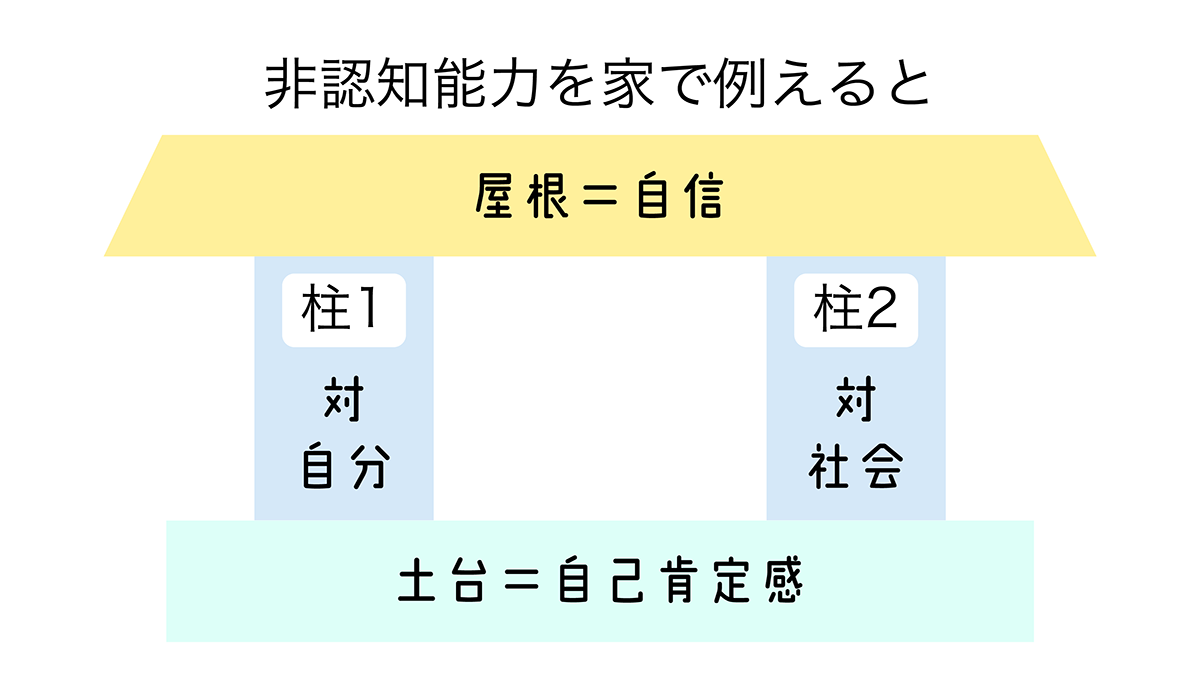 「非認知能力」を1軒の家として例えるなら、まずは自己肯定感が土台にあり、①対自分への能力、②対他者への能力という2つの柱があって、自信が屋根の部分にあたると考えています。