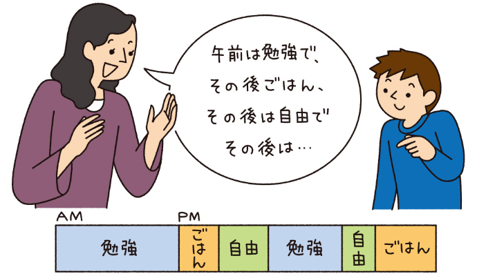 一緒に問題を解く、わからないところは一緒に解き方を考える、問題をクイズ形式にして答えさせる、などする