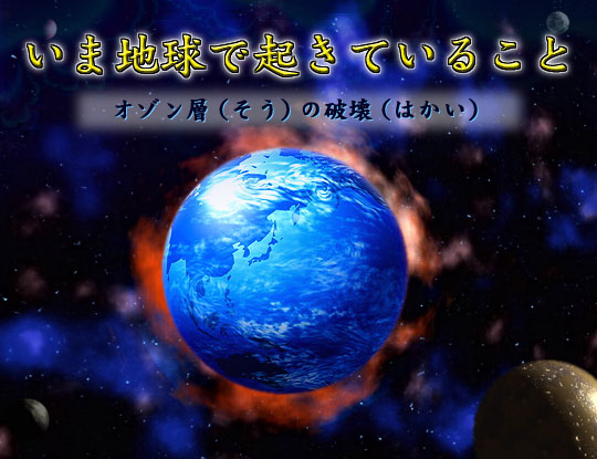 | みんな、地球が「オゾン層」に囲まれているって知ってた? オゾン層は、太陽からの有害な紫外線(しがいせん)からぼくたちを守ってくれている地球のカーテンのようなものなんだ。 けれど、いま、そのオゾン層がなくなってきている。 オゾン層がなくなると、皮膚(ひふ)ガンになる人が増えてしまったり、たくさんの植物、動物にわるい影響(えいきょう)をあたえるんだ。 |
