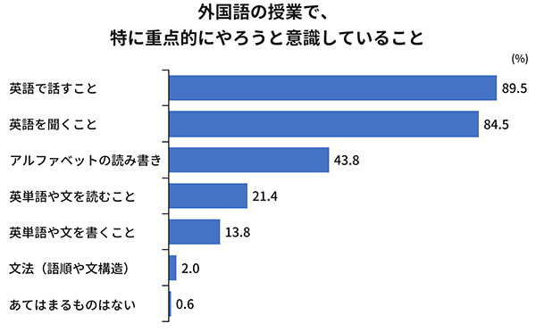 小学校の先生が英語の授業で、「特に重点的にやろうと意識していること」は、「英語で話すこと」「英語を聞くこと」でした。同じ調査を3年連続で行っていますが、この2つが最も多い結果が続いています。