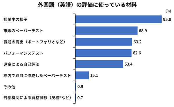 評価というと、ペーパーテストを思い浮かべられるかもしれませんが、英語の評価に使っている材料では、「授業中の様子」が圧倒的に多いです。先ほど、小学校の先生が英語の授業で重点的にやろうと意識していることの上位に「英語で話すこと」や「英語を聞くこと」があることを紹介しました。自分が伝えたいことについて、身振り・手振りを付けながら、がんばって話そうとしたり、一生懸命英語を聞き続けようとしたりする態度などは、評価の材料である「授業中の様子」の具体例として考えられます。