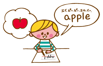 エイ、ピー、ピー、エル、イーと一字ずつ読み上げながら書き、単語が完成したら、声に出して “apple” と単語として読みます。