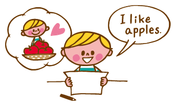 単語をひとつひとつ、声に出しながら書いていきます。文が完成したら、「わたしはリンゴがすき。」という意味を確認して、 “I like apples.” と声に出して読みましょう。