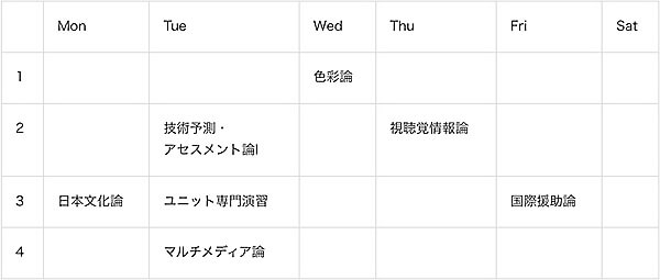 先輩の時間割では、日本文化、マルチメディア、色彩、視聴覚情報といった授業が見られます。これらは人間の文化・情報などとの関わりや知覚を研究するものです。