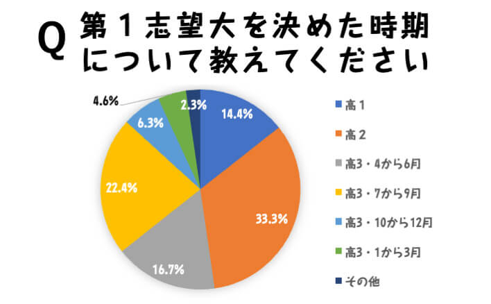 つまり、今回アンケートに協力してくれた大学生のうち、半数が高3進級前に第1志望大を決定していたことになります。
