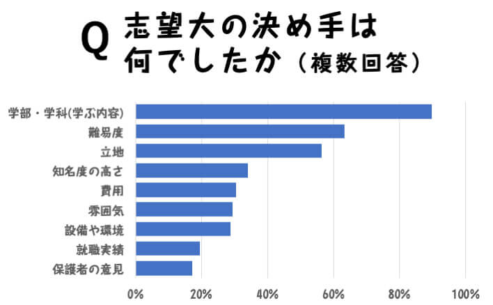 志望大決定に関して、決め手となった項目をすべて挙げてもらったところ、約90%の人が「学部・学科(学ぶ内容)が決め手になった」と回答しました。