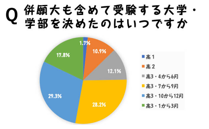 アンケートで「併願大も含めて最終的に受験する大学・学部を決めたのはいつ頃ですか?」と質問したところ、「高3の7~9月」が約28%、「高3の10~12月」が約29%と1、2番目に多く、それぞれ約3割見られました。