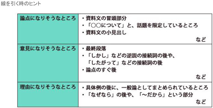 最初に資料文をざっと読みます。その時、必要な要素である「論点」「意見」「理由」になりそうだと思ったところに線を引いておきます。また、何度も出てくるキーワードや、接続詞にも注意しながら印をつけるとよいでしょう。