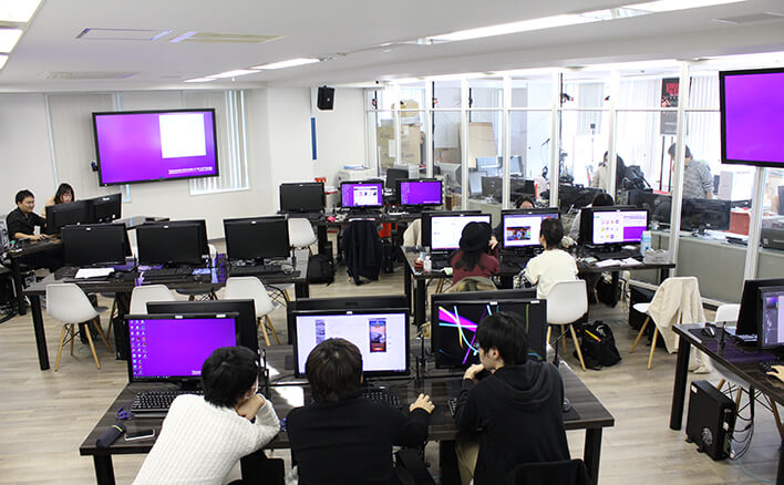 キャンパス内には、ゲーム分野を担当する井上幸喜教授が代表を務めるコンテンツ企画開発会社 JET MANと、映像制作会社のjet graphicsの2社が入居。大学の中に企業がある全国で唯一の例として、各方面から注目を浴びています。ガラス張りのオフィスで社員が働く様子は、学生が日々利用する「PC演習室」から間近に見ることができます。また、実際に学生がゲームコンテンツやアプリ制作、広報媒体制作などのプロモーションに携わるなど、就業体験の機会を提供。顧客が存在する実務経験の場、コンテンツクリエイター育成の場としても活用されています。