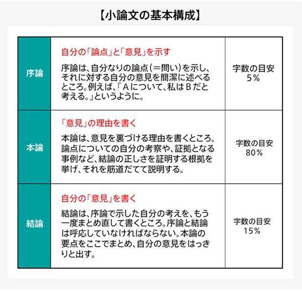 一方、小論文は、問われていることに対して自分の「意見」とその「理由」(論拠)を筋道立てて説明し、読む人を説得する文章のことです。論理性や説得力の高さにポイントが置かれます。