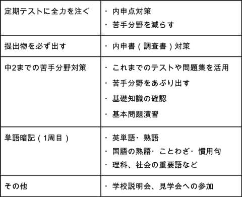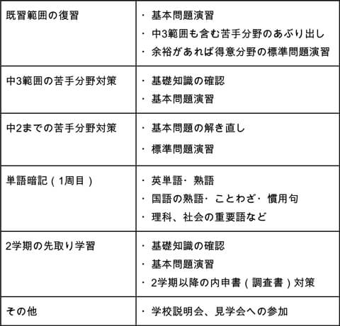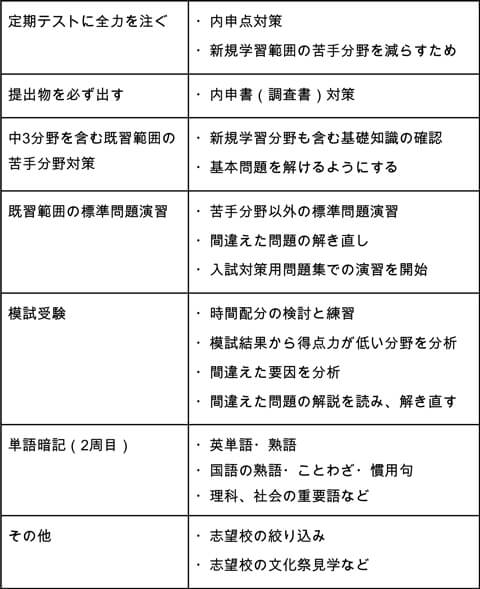 中学3年生1学期は、これまでの内申書(調査書)対策を続けながら、中2範囲までの苦手分野を復習しましょう。暗記学習もなるべく早く始めるのが得策。入試本番までに3周することを目指します。6月頃から学校説明会も始まりますので、興味のある高校の説明会や見学回に積極的に参加しましょう。