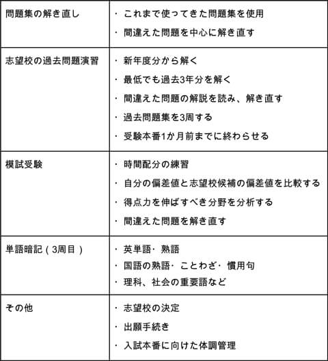 中3の冬休み以降は、これまで解いてきた問題集や志望校の過去問題集を何度も繰り返し解きます。新しい問題集を使うより、「何度も繰り返し練習して解けるようにする」ことを大切にしましょう。単語暗記は、いよいよ3周目です。あまり時間をかけず、覚えていないものだけ集中して覚えてしまいましょう。体調管理にも十分気をつけ、しっかり睡眠時間をとってください。