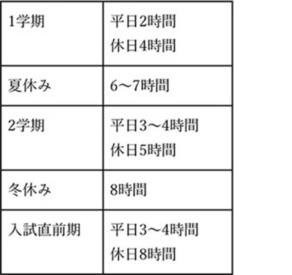 また、夏以降は部活動に割く時間も減り、入試本番が近づくほど勉強時間が長くなるもの。以下を目安に、お子さまの生活に合った勉強時間を検討してみてください。