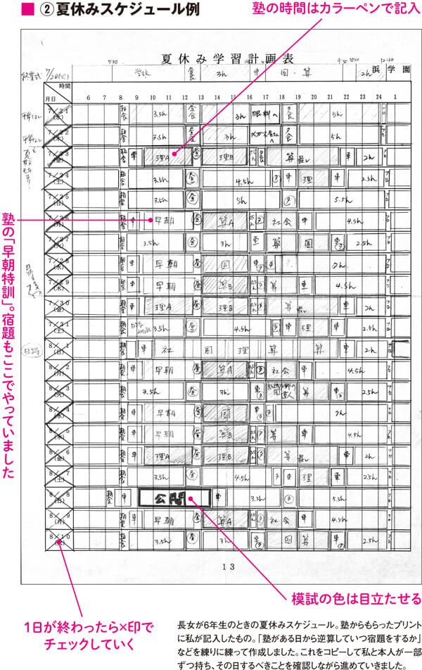 私は子どもたちのスケジュールを、1日、1週間、長期の休みごとに立てて、スケジュールを「見える」化していました。自分でやるべきことが見えること、全体量に見通しを立てておくことが、子どものやる気につながります。