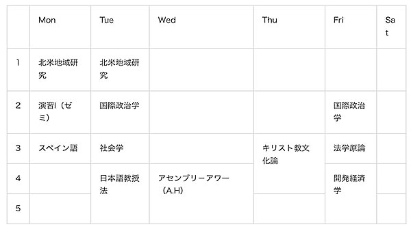 先輩の時間割では、世界全体を広い視野で見る「国際政治学」の他、特定の地域に絞った「北米地域研究」、社会の形成や構造などについて扱う「社会学」、異文化理解に必要な「キリスト教文化論」などが含まれています。