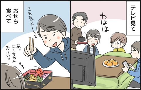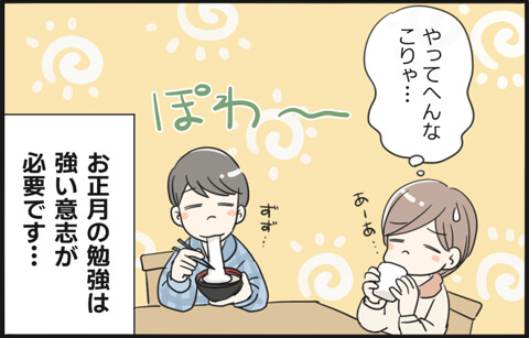中学受験の時は元日以外は授業(その名もお年玉特訓)があったのですが、通っていた予備校は年末年始ちゃんとお休み。コロナ&受験で帰省はしないので家にいるしかありませんが、その家では、仕事納めしておやつ食べている母、仕事と思ったらアニメ見ている父、10時間以上寝てる弟……環境が大変よろしくない。加えて、ピリッとしないお正月の空気感。長男は……お正月の誘惑に負けておりました。